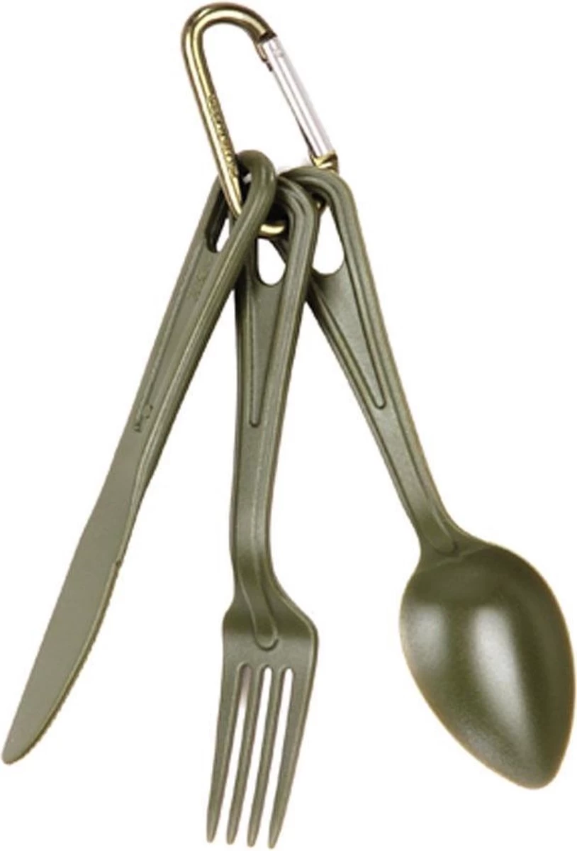Outdoor bestek met karabijnhaak. Camping en outdoor bestekset van Lexan materiaal bestaande uit een vork, mes en lepel. Met karabijnhaak.